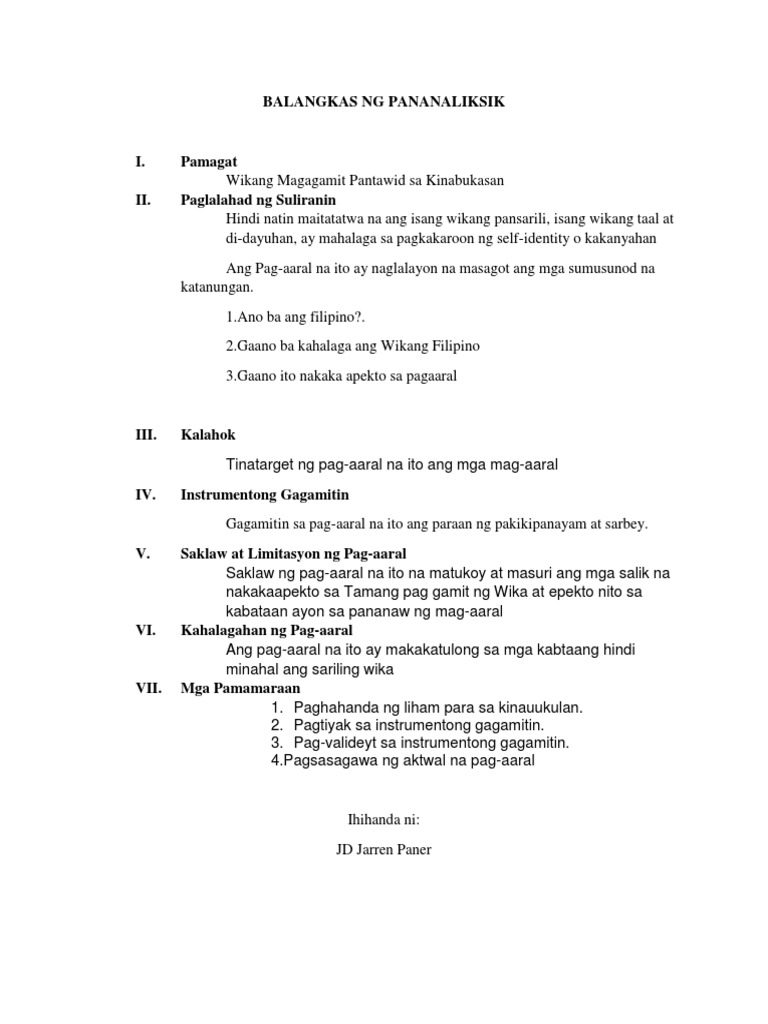 Halimbawa ng pananaliksik sa filipino. Masasabing hindi lingid sa kaalaman ng mga kabataan ang imporatansya at kahalagahan ng Wikang Filipino ngunit ang mga pangunahing kaalaman na meron sila ay dapat pang lingangin upang mas maunawaan pa nila at mahalin ang Wikang Filipino. Fil11-Q4-W2-M5-Pagbasa 1pdf - Filipino 11 Filipino u2013 Ikalabing isang baitang Ikaapat na Markahan-Modyul 5 Mga Uri at Halimbawa ng Pananaliksik. Sa makabagong takbo ng panahon kung saan ang mundo ay pinatatakbo ng teknolohiyang bunga ng mga imbensiyon sa larangan ng Agham at Teknolohiya ang pananaliksik o riserts ay may mahalagang gampanin sa ibat ibang larangan.