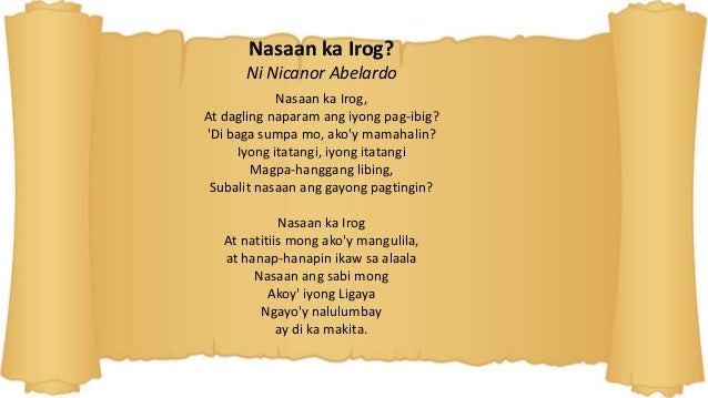 Halimbawa ng tulang liriko tungkol sa pag ibig. TULA TUNGKOL SA PAG-IBIG Narito ang mga mga iba pang mga halimbawa ng tula para sa ina na maari ninyong gawing regalo para sa kasintahan o mahal mo. Halimbawa ng tula para sa ina na may 12 sukat 4 taludtod at 5 saknong by Guest19868150 10 years 8 months ago 30 LIKES Like UnLike. Kung nais mong magsumite ng sarili mong tula tungkol sa pag-ibig makipag-ugnayan sa amin dito.