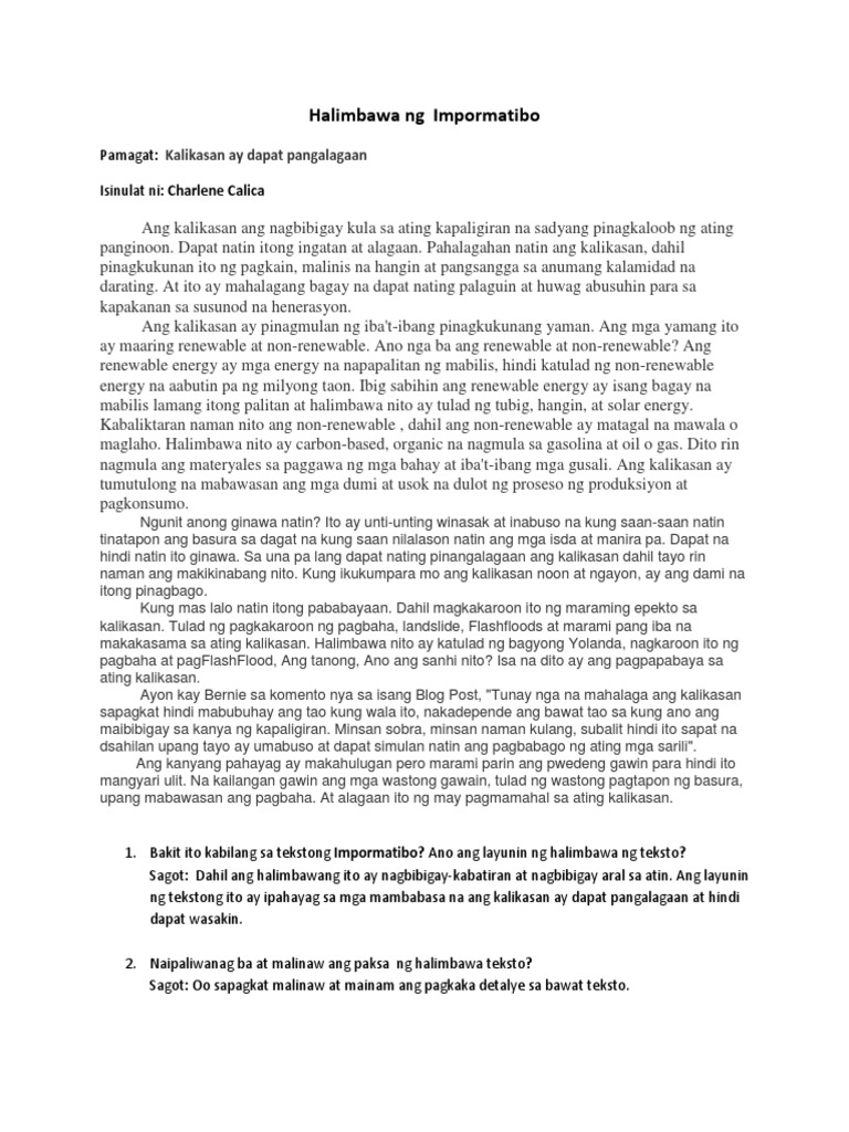 Tekstong impormatib halimbawa tungkol sa kalikasan. Ang tekstong impormatibo ay isang uri ng teksto na nagbibigay kaalaman sa mga mahahalagang pangyayariIto ay may laman na tiyak na impormasyon sa isang pangalan. Halimbawa ng tekstong argumentativ tungkol sa pamilya.