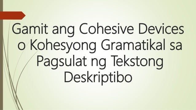Upang mas maging mahusay ang pagkakahabi ng tekstong deskriptibo bilang bahagi ng iba pang uri ng teksto o kayay maging mas malinaw ang anumang uri ng teekstong susulatin kinakailangan ang paggamit ng mga cohesive device o kohesyong gramatikal. Ito rin ay pagbibigay ng opinyon ng may akda o nagsasalita upang mahikayat ang kanilang kausap. 10122019 GAMIT NG COHESIVE DEVICES O KOHESYONG GRAMATIKAL SA PAGSULAT NG TEKSTONG DESKRIPTIBO Mayroong limang pangunahing cohesive device o kohesyong gramatikal ay ang sumusunod.