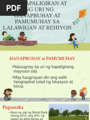 ANG URI NG HANAPBUHAY AT PAMUMUHAY SA LALAWIGAN AT REHIYON HANAPBUHAY at PAMUMUHAY Naiuugnay sa uri ng kapaligirang mayroon sila May kaugnayan din ang salik heograpikal tulad ng lokasyon at klima Pagsasaka Ayon sa ulat ng World Bank noong 2010 ang 40 ng lupain sa ating bansa ay nagagamit sa pagtatanim Ang mga taniman o sakahan ay karaniwang matatagpuan sa mga lalawigan at rehiyon sa bansang nasa mga kapatagan lambak talampas Mga Pangunahing Pananim Palay isa sa. 01122020 kawalan ng sapat na hanapbuhay para sa mga tao at kawalan na rin. 03052012 Mga uri ng hanapbuhay.