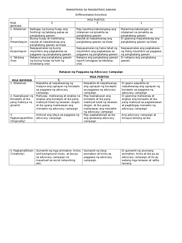Filipino halimbawa ng rubrics sa pangkatang gawain johnrawbirth4393 is waiting for your help. Ito ay Pangkatang Gawain na kung saan kailangan ninyong bumuo ng isang adbertisment tungkol sa Globalisasyon. Pagkakahati sa pagitan ng mga Kristiyano at Muslim Sagot para sa Gawain ng Pangkat 3 Gamitin ng guro ang rubric upang tasahin ang ipinakitang Role Playing Gawain C Pangkatang Gawain Maaaring iba-iba ang saloobin at opinyon ng mga mag-aaral sa paggawa ng poster.