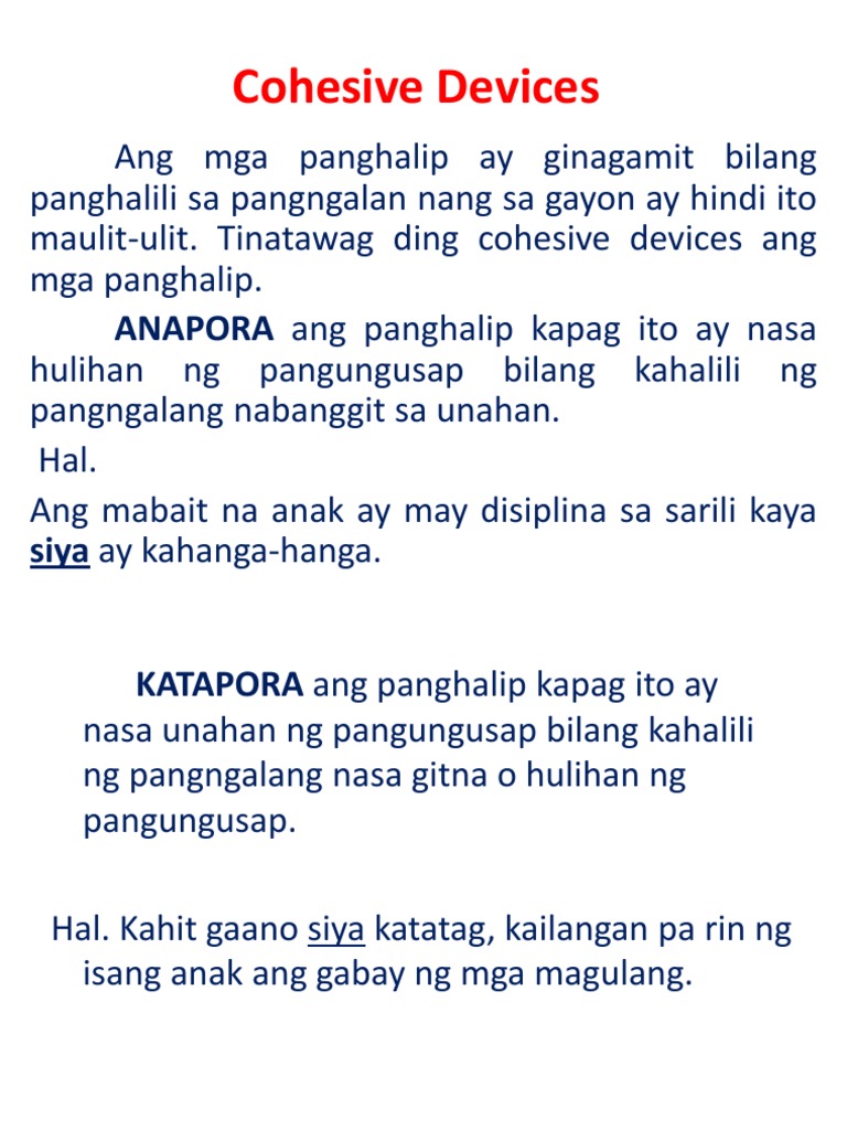 Pagkakaltas sa isang salita subalit nauunawaan pa rin ang pahayag. Anapora- karaniwang makikita sa hulihan ng isang teksto o pahayag na nagsisilbing pananda sa. 722018 Cohesive Device sa Pagsulat ng Sariling Halimbawa ng Teksto.