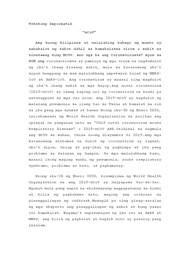 Sa kasalukuyan ako ay 15 taong gulang grade 9. 25022020 HALIMBAWA NG TEKSTONG IMPORMATIBO Sa paksang ito tatalkayin natin kung ano nga ba ang tekstong impormatibo. Uri Ng Tulang Liriko Pdf.