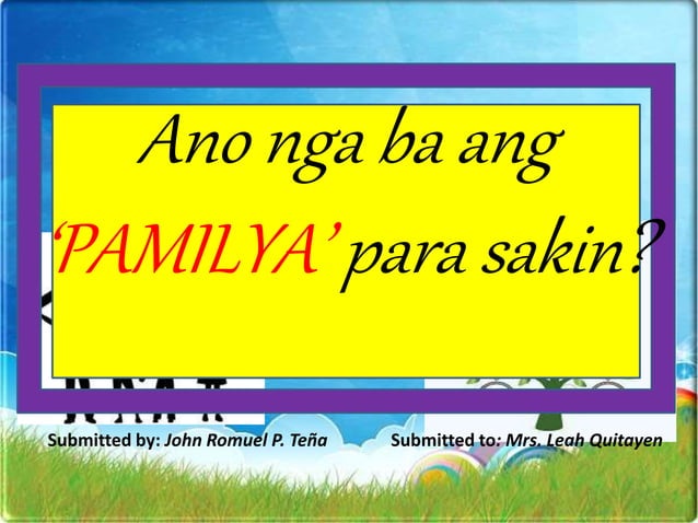 Mga Halimbawa ng Maikling Kwento Tungkol sa Pamilya Ang Inang Matapobre. Mula sa madilim na karanasan binigyan niya ng liwanag ang aking daan. Ang pamilya ang tinaguriang pinakamaliit na sangay ng lipunan.
