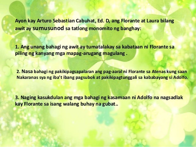D ang Florante at Laura bilang awit ay sumusunod sa tatlong monomito ng banghay. Pagwawangis - isang paghahambing na kung saan ito ay hindi ginagamitan ng mga salitang tulad ng parang ng atbp. Mga Uri ng Tayutay 2.
