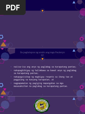 Nabibigyang-halaga ng mga mag-aaral ang pag-unawa sa mga karapatan at tungkulin ng tao sa lipunan. Ang Karapatang Pantao mula Pagkabata Hanggang Kamatayan Sa pagkapanganak pa lamang ay nagtatamasa ng tiyak di-maihihiwalay buo at di-maitatanging mga karapatan ang tao na mananatili sa kanya hanggang sa kanyang libingan. Ang paglaganap ng prostitusyon ay tila nangangahulugan na pinahihintulutan ng.